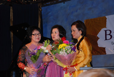 Nữ sĩ Bích Huyền (giữa) và những bó hoa ân tình. (Hình: Nguyên Huy/Người Việt)