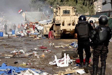 Sáng sớm 14/8, cảnh sát Ai Cập với xe bọc thép, máy ủi đã rầm rộ tiến vào giải tán hai khu trại của người biểu tình tại Cairo. Cảnh tượng tại hiện trường như một vùng chiến sự, với rất nhiều người chết và bị thương.