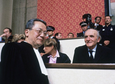 Klaus Barbie (phải), cựu trưởng mật vụ Gestapo thành phố Lyon, mỉm cười trong khi luật sư biện hộ Jacques Verges bước ngang qua trong phiên sơ thẩm xử ông Barbie vào ngày 11 Tháng Năm 1987. (H́nh: AP)