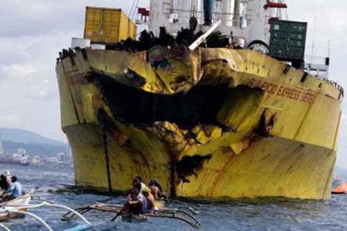 Mũi tàu chở hàng vị vỡ tan, chứng tỏ đây là một vụ đâm tàu cực mạnh.