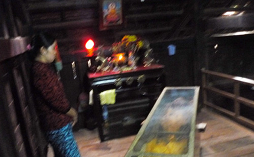 Trong căn nhà cổ kính, ông Đinh Công Trí, em trai của ông Hạo năm nay đă 60 tuổi nằm bất động trên vơng. Mấy năm gần đây, ông bị căn bệnh tiểu đường hành hạ khiến sức tàn lực kiệt. Khách phải nhờ con dâu của ông dẫn lên gác, nơi đặt bàn thờ và quan tài của ông Hạo để tận mắt nh́n thấy thi thể.