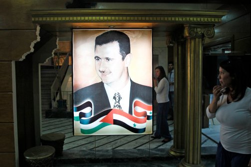 Bức chân dung của Tổng thống Syria Bashar al-Assad trước tòa nhà đài truyền hình quốc gia Syria.