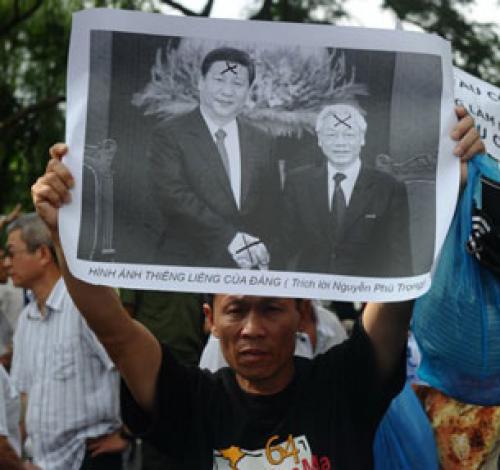 Người biểu t́nh chống Trung Quốc tại Hà Nội hôm 02/6/2013 với bức ảnh ông Tập Cận B́nh và ông Nguyễn Phú Trọng. (AFP)