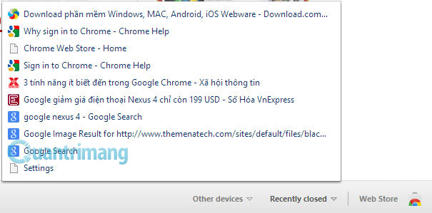 Trình duyệt Chrome đã cung cấp một danh sách các tab đã đóng bằng cách mở một tab mới và sau đó click vào mục Recently Closed nằm kế bên mục Other Devices ở trên. Tuy vậy, nó chỉ hiển thị được tối đa 10 trang web ứng với 10 tab đã đóng mà thôi.