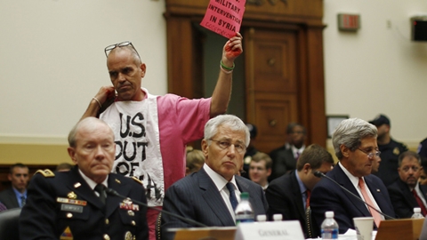 Người dân Mỹ phản đối can thiệp quân sự vào Syria trong phiên điều trần tại Quốc hội hôm 4/9. Tham gia điều trần trước Tiểu ban đối ngoại Thượng viện có tướng Martin Dempsey - tổng tham mưu trưởng quân lực, Bộ trưởng quốc pḥng Chuck Hagel và Ngoại trưởng John Kerry (từ trái sang) - Ảnh: Reuters