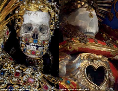 Được trang trí với hàng trăm loại đá quư bao gồm kim cương, ruby, lam ngọc, ngọc trai... cùng với rất nhiều vàng bạc, những bộ xương khô này theo các ghi chép c̣n lưu giữ th́ chính là di cốt của những vị Thánh.