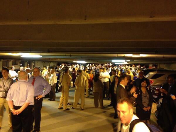 Các nhân viên của NAVSEA lánh nạn dưới hầm để xe của ṭa nhà. Ảnh được đăng trên Twittter của một nhân chứng. |