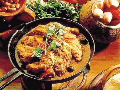 Làm khô gà trên lửa cao trong 1 cái chảo chiên. Đặt gà trong chảo nướng và phết lên gà 2/3 nước xốt. Nướng gà trong lò khoảng 30-35 phút ở nhiệt độ 225 độ C. Đổ nước xốt còn lại lên gà và nướng chín gà ở nhiệt độ cao hoặc nướng cho vàng nâu. Cắt gà thành 8 miếng và trang trí với dừa và ớt.