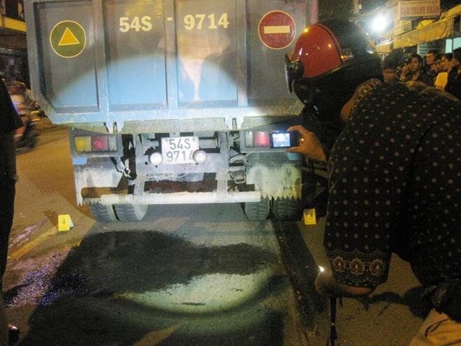 Thi thể nạn nhân bị kẹt dưới gầm xe ben.