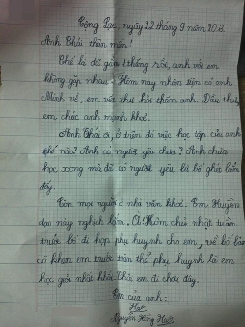 Bức thư này là do cô bé học lớp 3 gửi anh trai đi học xa nhà, cô bé Nguyễn Hồng Hà ở Cộng Lạc, Tứ Kỳ, Hải Dương. Ngay sau khi bức thư được đưa lên mạng, đã thu hút đông đảo sự chú ý của cộng đồng mạng, với 40.000 lượt xem.
