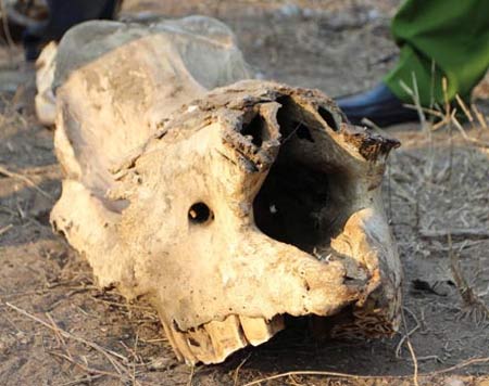 Đầu con tê giác, sau khi bị đám linh cẩu và kền kền ăn hết thịt da, trơ lớp xương trắng và các cụm gân đỏ trắng cho thấy con vật mới chỉ bị sát hại cách đây chưa lâu. Đám kền kền đán nhau để tranh ăn, c̣n để lại rất nhiều lông rụng quanh khu vực. Đầu con tê giác bị các nhát rừu bổ nham nhở, xương sọ vỡ nứt, các vết rừu chém c̣n rơ rành rành.