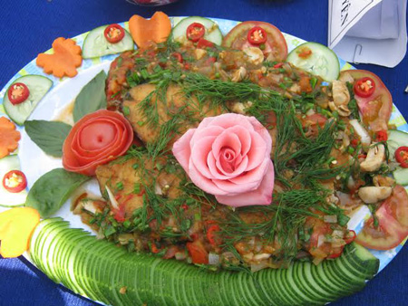 Món cá thu sốt cà chua mang hương vị đậm đà, một món ăn cân bằng âm dương, ngũ hành tương sinh. Món ăn tạo được nhiều loại màu sắc xanh, đỏ, vàng, trắng, đen từ các nguyên liệu; cá thu, hành tây, hành lá, cà chua, nấm rơm, tỏi, ớt đỏ, dưa leo, cà rốt và gia vị.