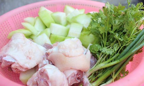 500 g giò heo, 300 g bí đao, hành, ngò, tỏi, tiêu xay, dầu ăn, gia vị.