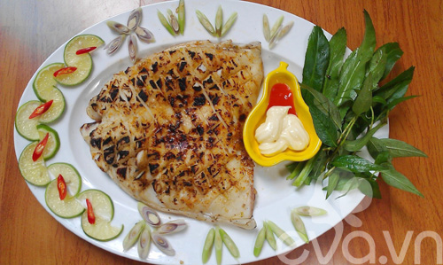 Bạn để mực ra đĩa, ăn nóng, khi ăn thì cắt nhỏ miếng mực cho vừa miệng. Chấm mực nướng sa tế với hỗn hợp sốt mayonnaise - tương ớt hoặc mù tạt đều rất ngon.