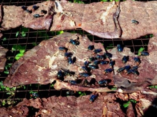 Phổi heo luộc, phổi heo còn sống để đầy nền sàn, đầy ruồi nhặng bu bám.