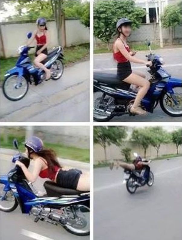 Ngày 7/11 trên các diễn đàn mạng dành cho giới trẻ xuất hiện hình ảnh thiếu nữ cưỡi xe máy với thư thế nằm sấp trên yên xe đầy mạo hiểm, khiến người xem thót tim. Màn biểu diễn này nhận được nhiều phản hồi trái chiều từ bạn trẻ, thông tin về cô gái nhanh chóng được tìm thấy.