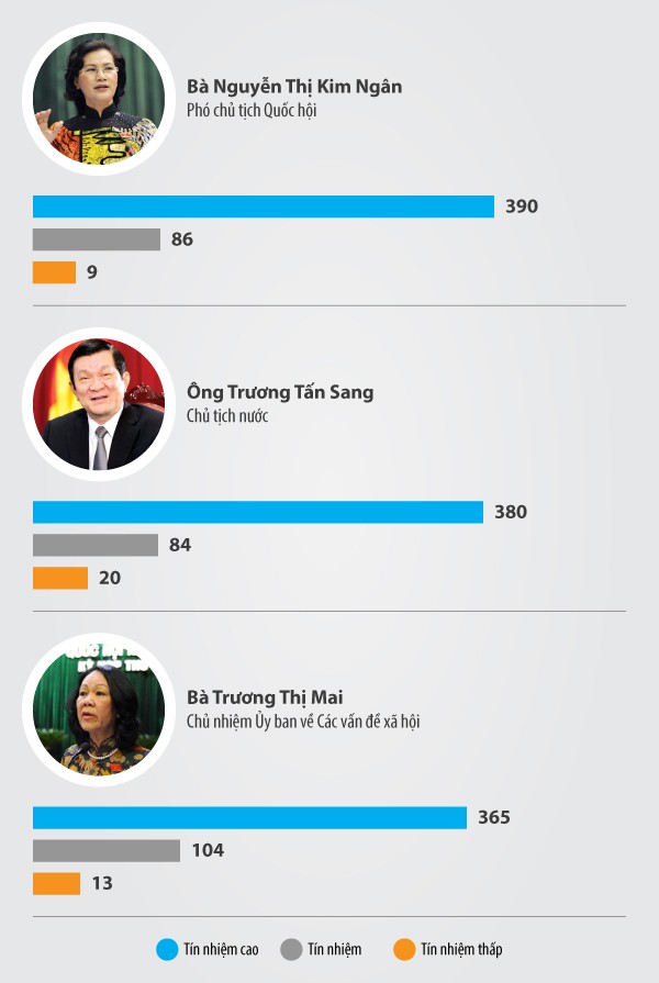Phó chủ tịch Quốc hội Nguyễn Thị Kim Ngân nhận được nhiều phiếu tín nhiệm cao nhất (390 phiếu); tiếp đó là Chủ tịch nước Tương Tấn Sang, với 380 phiếu; đứng thứ ba là Chủ nhiệm Ủy ban về Các vấn đề xã hội Trương Thị Mai (365 phiếu.