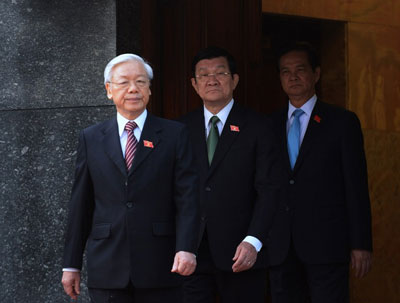 Từ trái sang: Tổng bí thư ĐCSVN Nguyễn Phú Trọng, Chủ tịch VN Trương Tấn Sang và Thủ tướng VN Nguyễn Tấn Dũng chụp trước lăng CT HCM hôm 20/10/2014. AFP photo |
