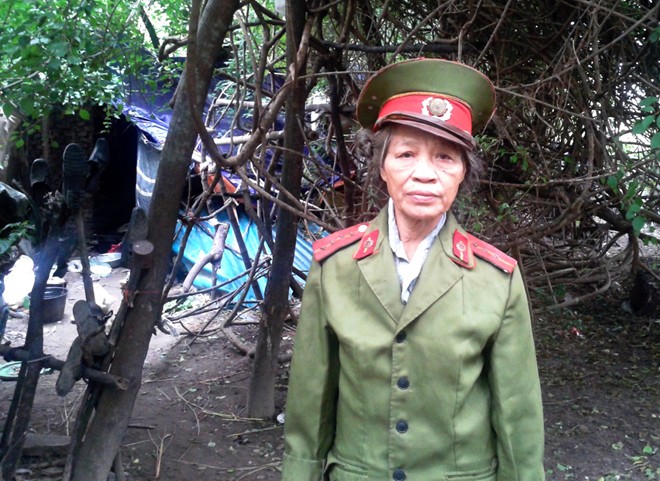 Bà Huệ từng là Trung tá công an. Trong ảnh là bộ đồ với hàm Đại úy mà bà còn giữ lại được, phía sau là "ngôi nhà" tạm bợ của bà.
