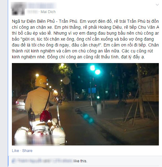 Sau khi kể chuyện chở vợ có bầu vượt đèn đỏ được CSGT bỏ qua, một người đàn ông ở Hà Nội bị dân mạng chỉ trích.