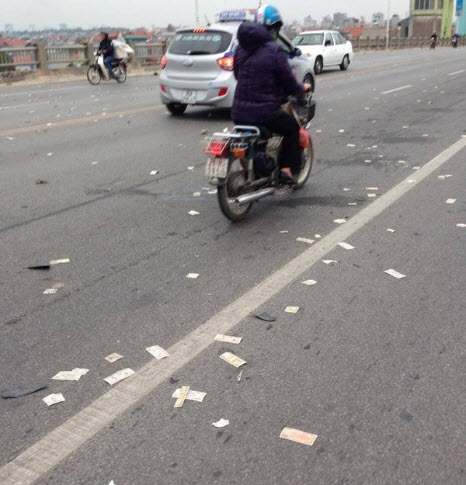 Thấy cảnh người điều khiển xe máy chết tại chỗ sau khi va chạm với xe tải trên cầu Vĩnh Tuy, Hà Nội, nhiều người đi ngang qua đó đã rải tiền lẻ. Một số người không biết chuyện đã dừng xe lại để nhặt số tiền này.