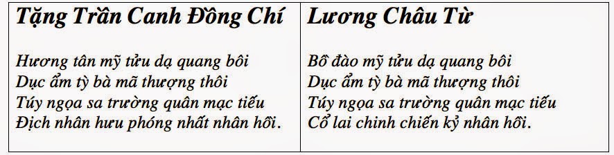 So sánh hai bài thơ tứ tuyệt “Tặng đồng chí Trần Canh” của HCM và “Bài hát Lương Châu” của Vương Hàn, cách nhau cả hơn một ngàn năm, mỗi bài thơ chỉ có 28 chữ, mà hai bài thơ chỉ khác nhau có bảy chữ. Đó là hai chữ đầu bài thơ (“bồ đào” thay bằng “hương tân” tức rượu champagne; và năm chữ câu cuối). Còn hai câu giữa hoàn toàn giống nhau, nghĩa là hết ba phần tư (3/4) bài thơ nguyên là của bài “Lương Châu từ” của Vương Hàn.