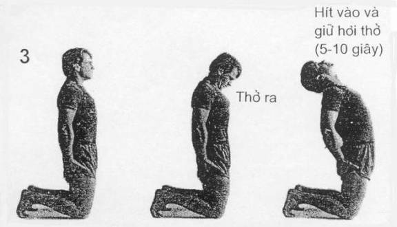 Thức thứ ba: Quỳ gối trên sàn nhà và giữ cho thân mình thẳng đứng, hai bàn tay áp sát vào đùi. Sau đó nghiêng đầu và cổ về phía trước, cằm thu vào ngực. Tiếp đến ngửa đầu và cổ ra phía sau càng xa càng tốt, đồng thời ngả người ra sau, cong hẳn cột sống. Khi cong mình, bám cánh tay và bàn tay lên đùi để làm điểm tựa. Cong người xong, trở về với tư thế cũ và lặp lại lần nữa. Thức thứ tư: Ngồi xuống trên sàn nhà, hai cẳng chân duỗi ra phía trước, hai bàn chân đặt cách nhau khoảng 20 cm, gan hai bàn tay úp xuống sàn, dọc theo mông. Sau đó thu cằm về phía trước ngực. Tiếp đến ngả đầu ra phía sau, càng xa càng tốt đồng thời nhấc thân mình lên sao cho đầu gối cong lại trong khi hai cánh tay trở nên thẳng đứng. Với tư thế nầy, thân hình trở thành song song với sàn nhà, và thẳng góc với hai cánh tay và hai cẳng chân. Rồi gồng căng mọi cơ bắp của cơ thể. Cuối cùng khi quay trở lại với thế ngồi ban đầu, hãy thư giãn các cơ bắp và nghỉ một lúc trước khi lặp lại các động tác của thức tập.