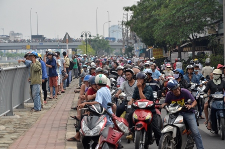 Rất đông người dân hiếu kỳ đứng 2 bên bờ kênh để theo dõi khiến giao thông qua khu vực gặp nhiều khó khăn.