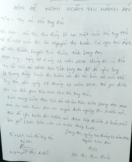 Em gái của Hải là Hồ Thị Thu Thủy lúc này cùng dì ruột Nguyễn Thị Rưỡi, láng giềng thân thiết cũng tức tốc đến TAND tỉnh Long An. Hành trang mang theo là những tờ giấy bìa cứng với bút lông ghi "Ngưng thi hành án Hồ Duy Hải"...