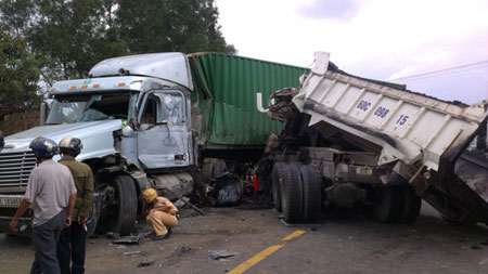 Cú đâm khá mạnh khiến đầu xe tải ben biển số 60C - 098.15 nát bét, thùng xe gần lật khỏi trục bánh xe. Xe đầu kéo cũng bị móp méo phần đầu và phần thùng container phía sau. Riêng tài xế Ri tử vong tại chỗ.