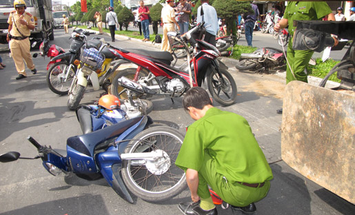 Tại hiện trường cho thấy, chiếc xe cần cẩu đã đâm thẳng vào ít nhất 10 chiếc xe máy, vượt qua vạch đèn đỏ khoảng 10m. Nhiều xe tay ga, xe số bị nghiền nát phía trước bánh xe cần cẩu này.