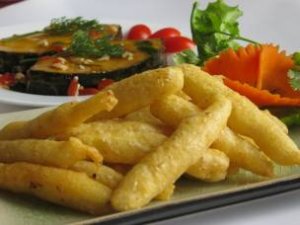 - Đun sôi dầu ăn, nhúng ngô vào tô bột rồi thả vào chảo dầu chiên chín vàng.