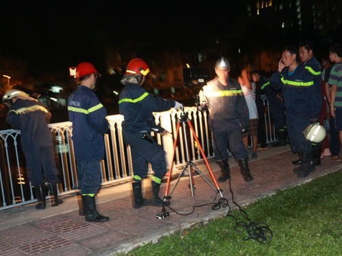Khoảng 20 giờ 30, cảnh sát cứu hộ cứu nạn thuộc PCCC quận 1 tiến hành rọi đèn, tìm kiếm kẻ trộm.