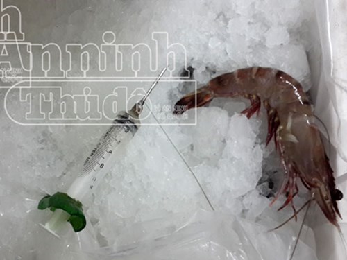Để tôm sú đông lạnh có màu tươi sống, tôm cứng, đẹp và đặc biệt là nặng cân… hai cơ sở kinh danh thủy sản tại phố Tân Mai, phường Tương Mai, quận Hoàng Mai, Hà Nội, đă tiêm bột Agan vào thân tôm sú.