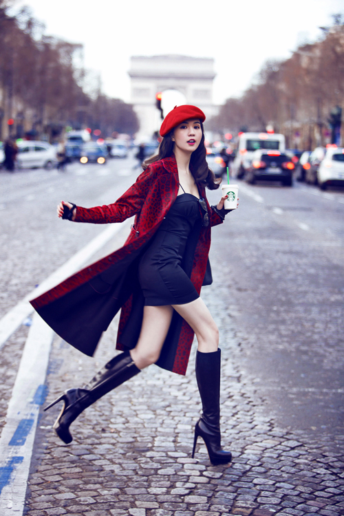 Chân dài diện áo khoác da báo đỏ, trị giá hơn 200 triệu đồng, đội mũ nồi xinh xắn dạo chơi trên đường phố Paris.