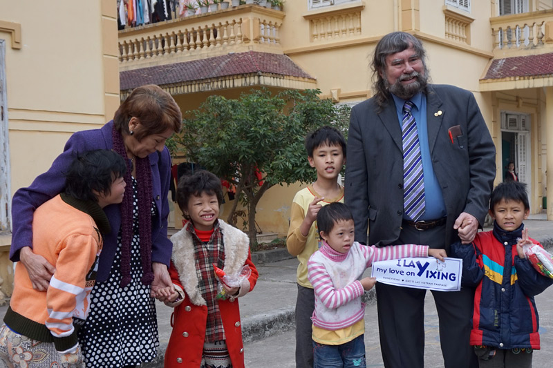 Vợ chồng cựu binh Mỹ James Rhodes với các em nhỏ nạn nhân chất độc da cam tại Làng Hữu nghị Việt Nam