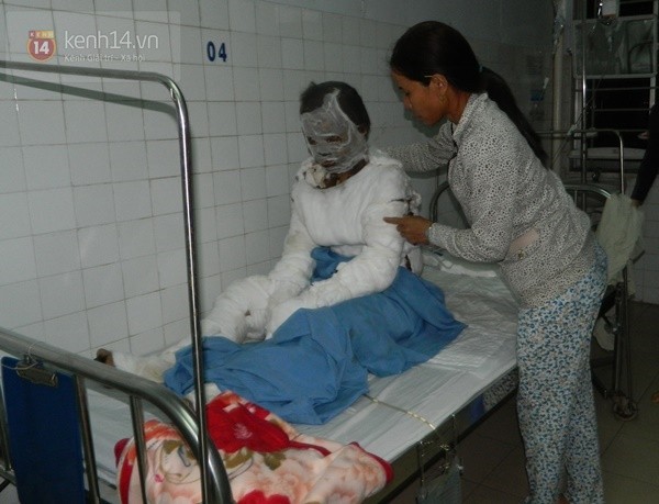Chúng tôi tìm đến khoa Ngoại Bỏng, Bệnh viện Đa khoa Đà Nẵng, nơi chị Đỗ Thị T. đang điều trị, dù may mắn giữ được mạng sống nhưng sức khỏe của chị T. vẫn còn rất yếu, các vết bỏng rất sâu, toàn thân chị phải quấn bông băng.