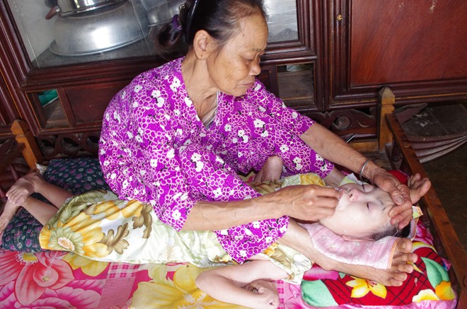 Nhà bà Thanh nằm khuất lấp sau vườn cao su bạt ngàn ở thôn 1, xã Ea Ta, huyện Cư M’gar, Đắk Lắk. Ngôi nhà nhỏ được nhà nước xây tặng khang trang nhưng luôn trống trải. Bởi trong căn nhà ấy giờ chỉ còn người đàn bà nhỏ thó, khuôn mặt khắc khổ và người con gái tên Nguyễn Thị Chi (27 tuổi) bị tật, đặt đâu nằm đó. Bà Thanh bảo, trước đây gia đình bà đông vui lắm, bà có 5 người con đều đã lớn và lập gia đình. Con bà muốn ở gần mẹ và em gái bạo bệnh để quan tâm, chăm sóc nhưng vì hoàn cảnh khó khăn, lại không có đất canh tác nên đều phải làm ăn xa. Còn chồng bà đã vui duyên mới ở tận Nghệ An. Nói về Chi, bà rơm rớm nước mắt cho hay, cô bị bại não do nhiễm chất độc màu da cam, từ bé đã không thể nói cười, nhận thức được như bao đứa trẻ khác, tay chân bị teo tóp co quắp. Ngày ngày bà phải ở bên để chăm sóc con từ việc cho ăn đến vệ sinh thân thể. "Khổ nhất là lúc trái nắng trở trời, cháu đau nhức khắp cơ thể, tôi lại thức thâu đêm xoa bóp cho nó, ngày hôm sau lại nằm thiếp đi bên cạnh con", người mẹ già 63 tuổi kể. Bà Thanh khó nhọc bón cơm cho con. Nhiều lần bà đau ốm, các con ở xa về, hàng xóm sang chăm sóc, vệ sinh, bón cơm cho Chi thay bà nhưng cô bé đều không đồng ý, chỉ chịu mỗi mẹ. “Thi thoảng tôi nằm liệt giường, các anh chị nó hoặc hàng xóm đành phải pha trò hề cho Chi cười, tranh thủ lúc nó há miệng cười là phải nhanh tay đút cơm cho nó ăn, cứ thế làm miết đến khi nào hết bát cơm mới thôi”, bà Thanh chia sẻ. Do con gái không thể kiểm soát được việc vệ sinh nên bà phải mua thêm bỉm đóng cho Chi cả ngày. Bà tận dụng cả đám rèm cửa cũ may áo váy để con mặc cho rộng và thoáng mát. Hàng ngày, khi cho con ăn, bà Thanh đều phải ngồi lên chiếc giường nhỏ, một tay cầm bát cơm, tay kia cầm thìa lấy cơm trong bát cho vào miệng nhai thật kỹ rồi cúi xuống mớm. Nhưng mỗi lần như vậy bà phải dùng hai chân kẹp để đầu Chi nằm ở chính giữa không bị ngả sang hướng khác. Ngồi mớm lâu mỏi cổ, bà lại dùng tay bón cho Chi dù cô không đồng ý. Tuổi đã cao, lại bị viêm tai, loét dạ dày, sức khỏe mỗi ngày một yếu đi nên điều bà Thanh lo lắng nhất là một ngày nào đó mình chết sẽ chẳng có ai chăm sóc cho con, bởi ngoài bà không ai có thể bón cơm cho Chi ăn được.