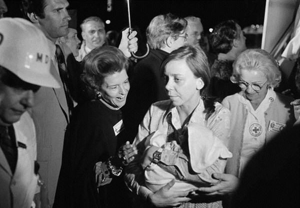 Đệ nhất Phu nhân Mỹ Betty Ford chào đón một trong những em bé được tình nguyện viên y tế đưa lên xe buýt quân đội, tại sân bay San Francisco ngày 5/4. Khi đó, một máy bay của hãng Pan Am Airlines chở 325 trẻ mồ côi từ Việt Nam vừa hạ cánh.