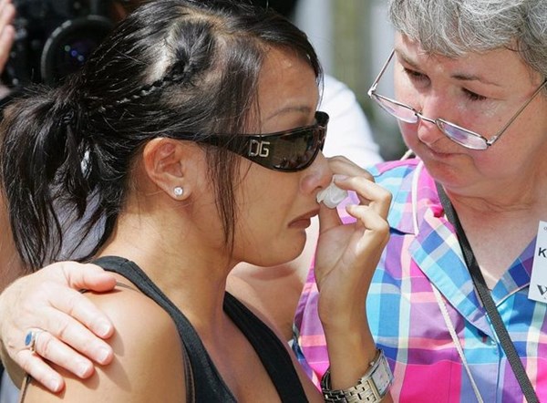 Cô gái mồ côi Lyly Kara Koenig, một thành viên của đoàn, rơi nước mắt khi thăm một trại trẻ và được mẹ nuôi an ủi.