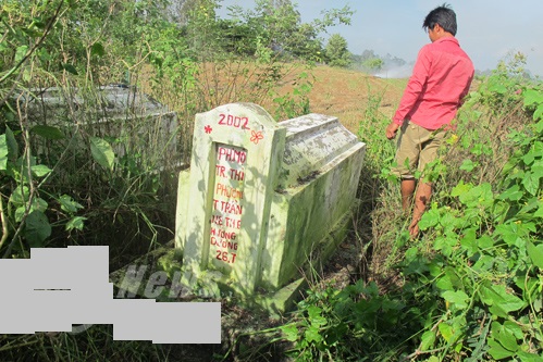 Vượt qua cây cầu treo bắc ngang rạch Mã Trường, sang đất Tân Huề, hỏi đường mấy lần, thì anh xe ôm dừng lại trước 2 ngôi nhà nằm chơ vơ bên triền đê, giữa cánh đồng bát ngát, dưới tán mấy cây bạch đàn. Ngôi mộ xây nổi trên mặt đất, nằm chềnh ềnh trước nhà. Một số vùng miền Tây Nam Bộ có tục chôn người chết ngay trước cửa nhà, để người sống được gần gũi người chết.