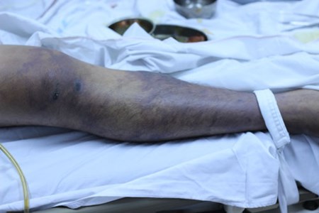 Chân bệnh nhân xuất hiện các ban xuất huyết hoại tử do ăn tiết canh
