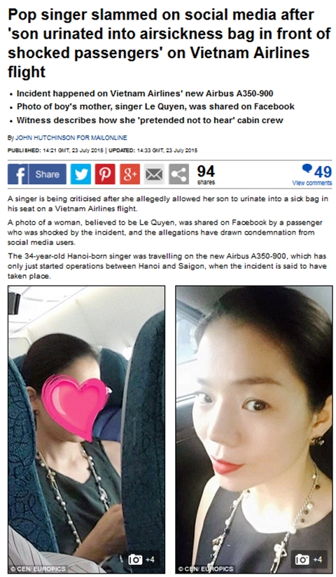 Scandal mới nhất của ca sĩ Lệ Quyên khi cho con tè vào túi nôn máy bay đã bị truyền thông nước ngoài chú ý. Cụ thể là, trên trang Yahoo news của Mỹ đã bất ngờ đăng tải hình ảnh và bài viết về scandal mới nhất của ca sĩ Lệ Quyên.