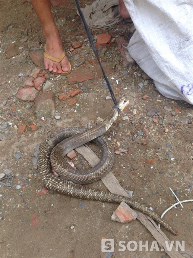 Thấy cả 3 đầu con rắn cùng nhau phi ra lại rụt vào, ai nhìn cũng sợ. Cùng lúc này, tôi gọi thêm một số anh em đến hỗ trợ, rồi chặn đầu từng con, dùng dây buộc và lôi ra khỏi ổ”.