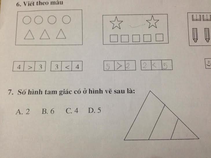 “Toán lớp 1 mà bố cháu hoang mang quá. Tưởng tượng kiểu gì cũng chỉ ra được 3 hình tam giác, mà lại không nằm trong đáp án. Có bác nào ra được kết quả như sách không ạ?” - một ông bố than thở và đưa ra bài tập toán của con như sau: