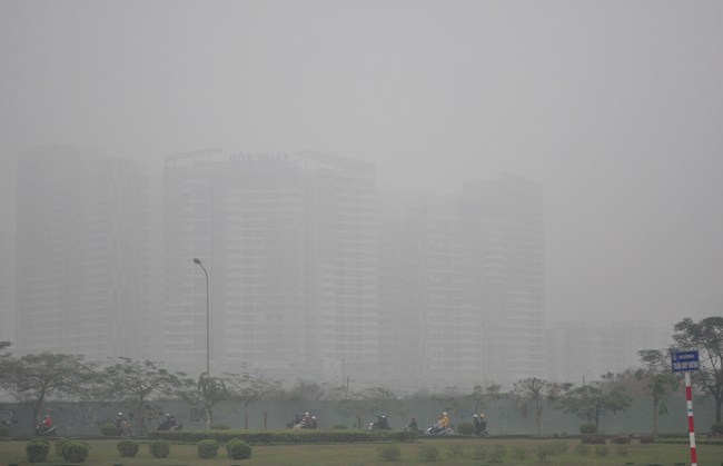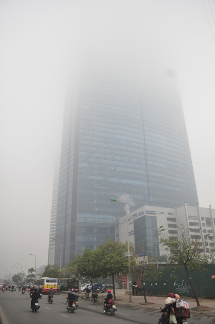 Tòa nhà cao nhất Việt Nam Keangnam (72 tầng) nằm trên đường Phạm Hùng dường như bị “mất nóc” do sương mù che khuất.