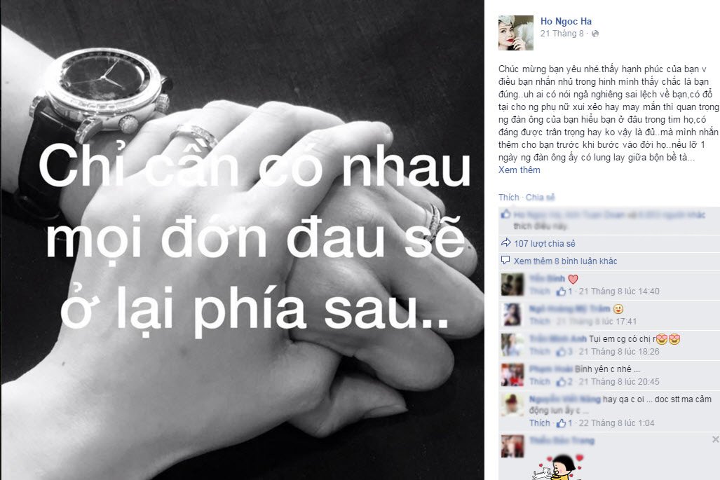 Ngay trước sự kiện "đại gia bế Hà Hồ" đ́nh đám làng giải trí, ngày 21.8 năm nay, trên trang cá nhân của ḿnh, nữ ca sỹ bất ngờ đăng h́nh ảnh hai bàn tay nắm vào nhau với lời nhắn "Chỉ cần có nhau, mọi đớn đau sẽ ở lại phía sau". Trong h́nh, đôi tay lồng vào nhau cùng đeo cặp nhẫn vợ chồng, ngoài ra chiếc đồng hồ trên cổ tay người đàn ông có h́nh dáng giống y chang chiếc đồng hồ mà đại gia K yêu thích.
