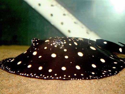 Còn đây là cá đuối nước ngọt Polka Dot (Freshwater Polka Dot Stingray). Như cái tên, nó có những đốm trắng trên cơ thể và phần đầu bị đột biến gen tạo thành hình chữ V (cá đuối bình thường có hình tròn). Bên cạnh đó, loài cá này gần như phải sống ở môi trường tự nhiên hoặc nuôi nhốt với chế độ ăn đặc biệt. Được biết, giá của nó lên tới 100.000 USD (gần 2,24 tỉ đồng).