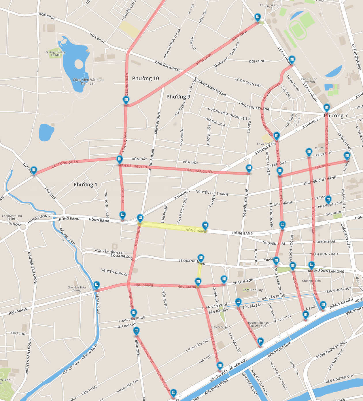 Các tuyến đường thuộc quận 6: Hùng Vương, Minh Phụng, Hậu Giang, Bình Tây, Mai Xuân Thưởng và Phạm Phú Thứ.