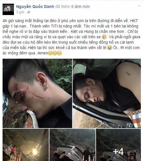 Vào lúc 4 giờ sáng ngày 13/12, xe hơi chở nhóm nhạc HKT trên đường đi diễn ở huyện Phù Yên, tỉnh Sơn La đã xảy ra tai nạn. Những hình ảnh về vụ tai nạn nghiêm trọng được thành viên Tuấn Kiệt chia sẻ trên trang cá nhân khiến không ít người hâm mộ tỏ ra hoang mang và lo lắng.